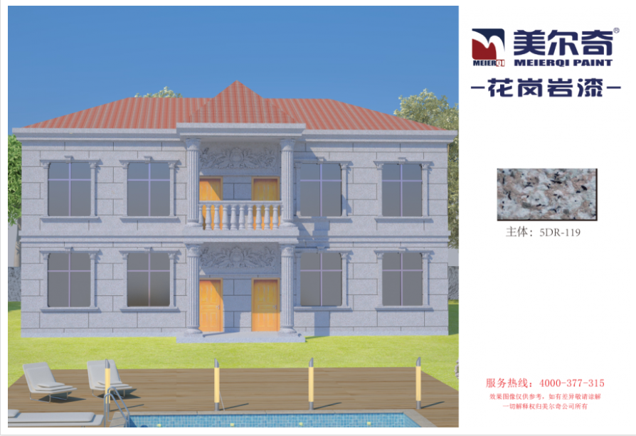 作為新型環(huán)保外墻裝飾涂料,美爾奇仿石漆輕質中硬,色彩天然逼真,使用抗開裂的高彈復合化工材料,耐擦洗、耐高溫、使用壽命長。具有防火、防水、耐酸堿、施工性優(yōu)、展色好、柔韌性好、強附著、強抗沖擊、高質感、粘力強、永不褪色等特點。